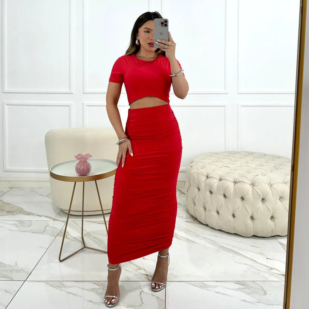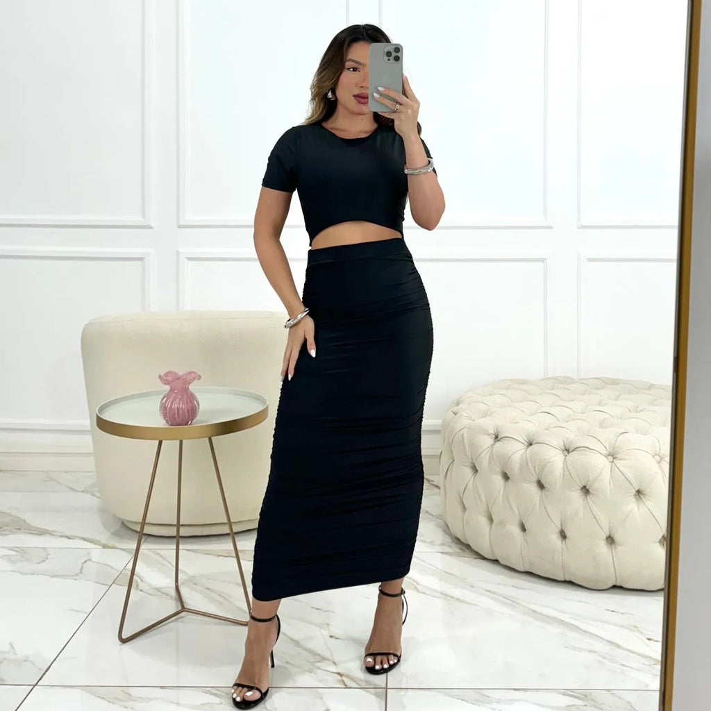 Elegância e conforto em cada detalhe! Top com detalhe central, com alça lateral e pescoço. Saia, com detalhe central. Confeccionado em 87% poliester e 13% elastano.